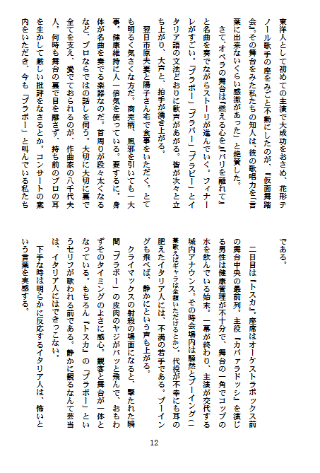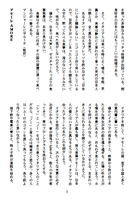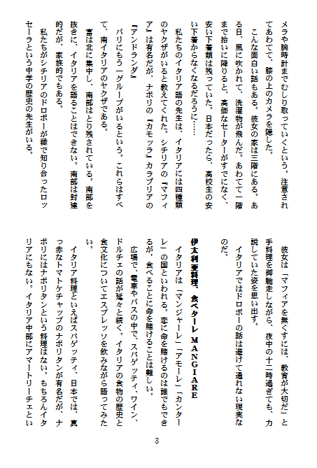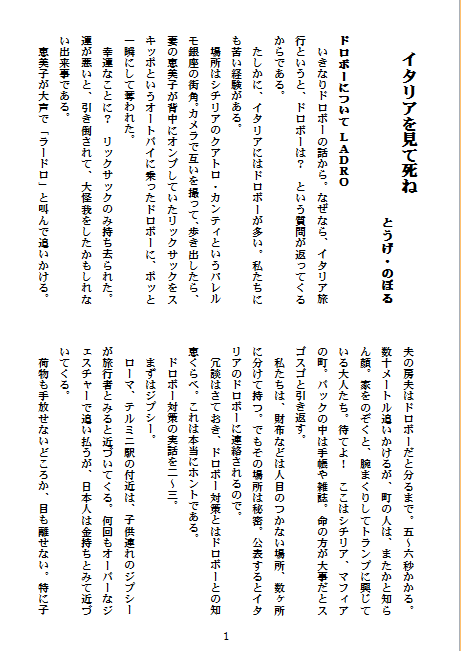 ようやく、『みさと』8号の最終編集が終わりました。来週中、出来れば28日に印刷に回す予定です。出来上がりは来月、20日頃になると思います。発刊後、順次作品を発表して行きたいと思いますが、それまでの間は『みさと』未発表作品のいくつかをご紹介して行きたいと思います。まず初めは、とうげさんの『イタリアを見てから死ね』をご紹介いたします。