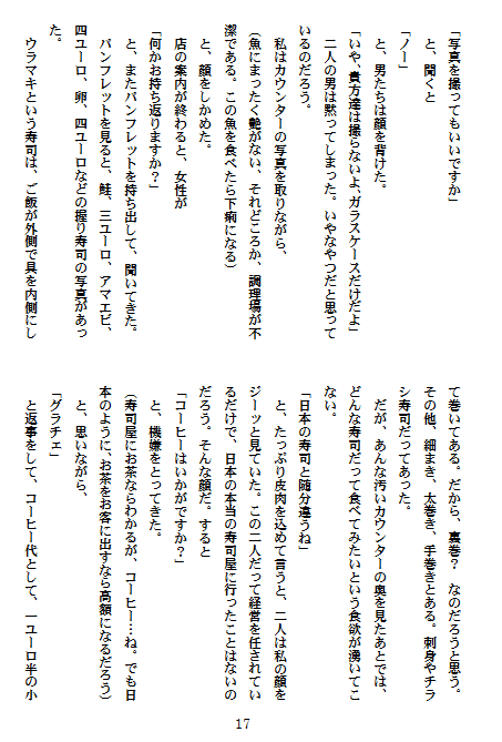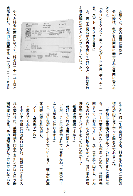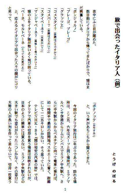 ようやく、『みさと』8号の最終編集が終わりました。来週中、出来れば28日に印刷に回す予定です。出来上がりは来月、20日頃になると思います。発刊後、順次作品を発表して行きたいと思いますが、それまでの間は『みさと』未発表作品のいくつかをご紹介して行きたいと思います。まず初めは、とうげさんの『イタリアを見てから死ね』をご紹介いたします。
