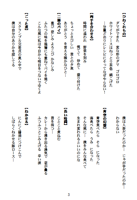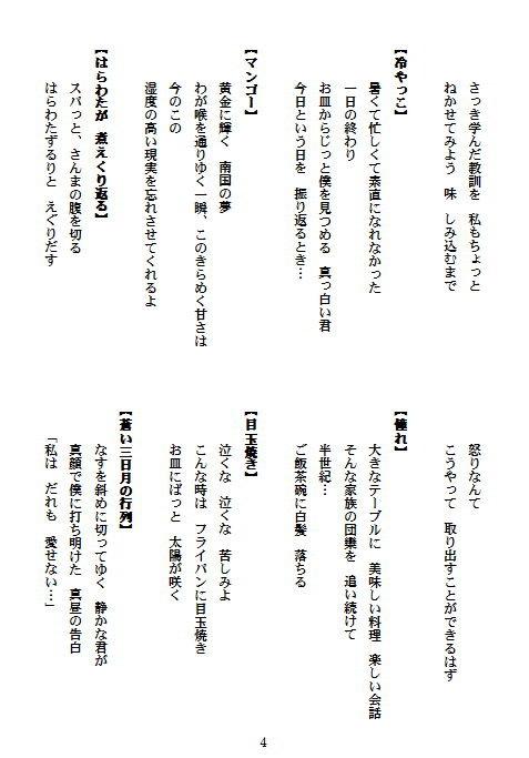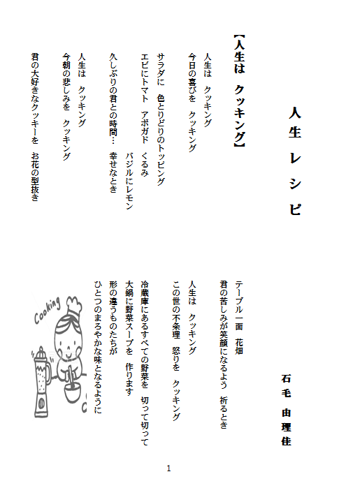 『みさと』8号の最終編集に掛りっきりで、ブログの更新にまで手が回りませんでした。体調が良くなかったせいもあります。今回は石毛さんの人生レシピ。人生を料理に例えて、ポップなリズムに乗せたポエム調で書いてくださいました。何だか自己流の曲を付けて、口ずさんでみたくなる詩ですね。そして、深~い意味が含まれている事にもお気づきでしょうか。では、どうぞ