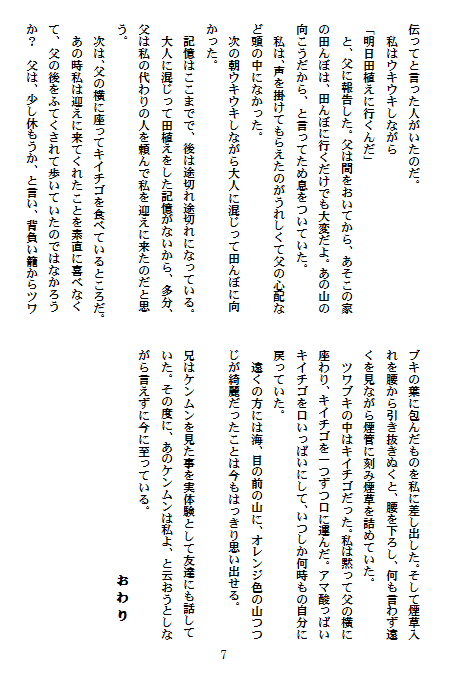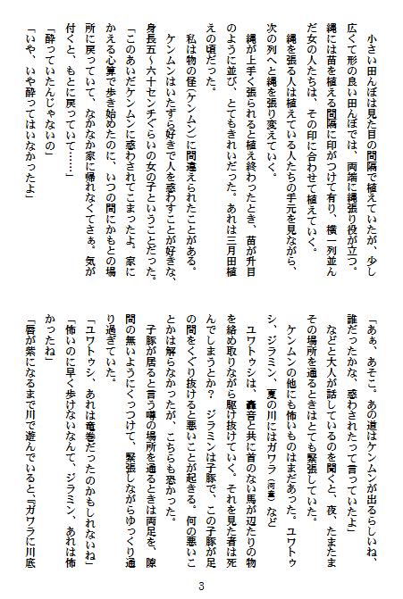 もう、12月も6日。いよいよ年の瀬も押し迫って、何となく気忙しく落ち着かない気持ちになります。特にジングルベルの音や歳末商戦のチラシなどに、「今年も、もう終わりかあ」などと行く先の短さにため息が漏れたりします。でも、だからこそ、残された短い時間を有意義に頑張らなくちゃ、良い作品を書きたいなあ、なども思いますが、それ、そこは凡人。無為に残り日を過ごしてしまいます。反省。という訳で、このブログも1カ月ぶりの怠惰の末のようやくの更新です。 妖怪ケンムンって? どんな妖怪なんでしょうね。まずは読んでのお楽しみです。ではどうぞ。